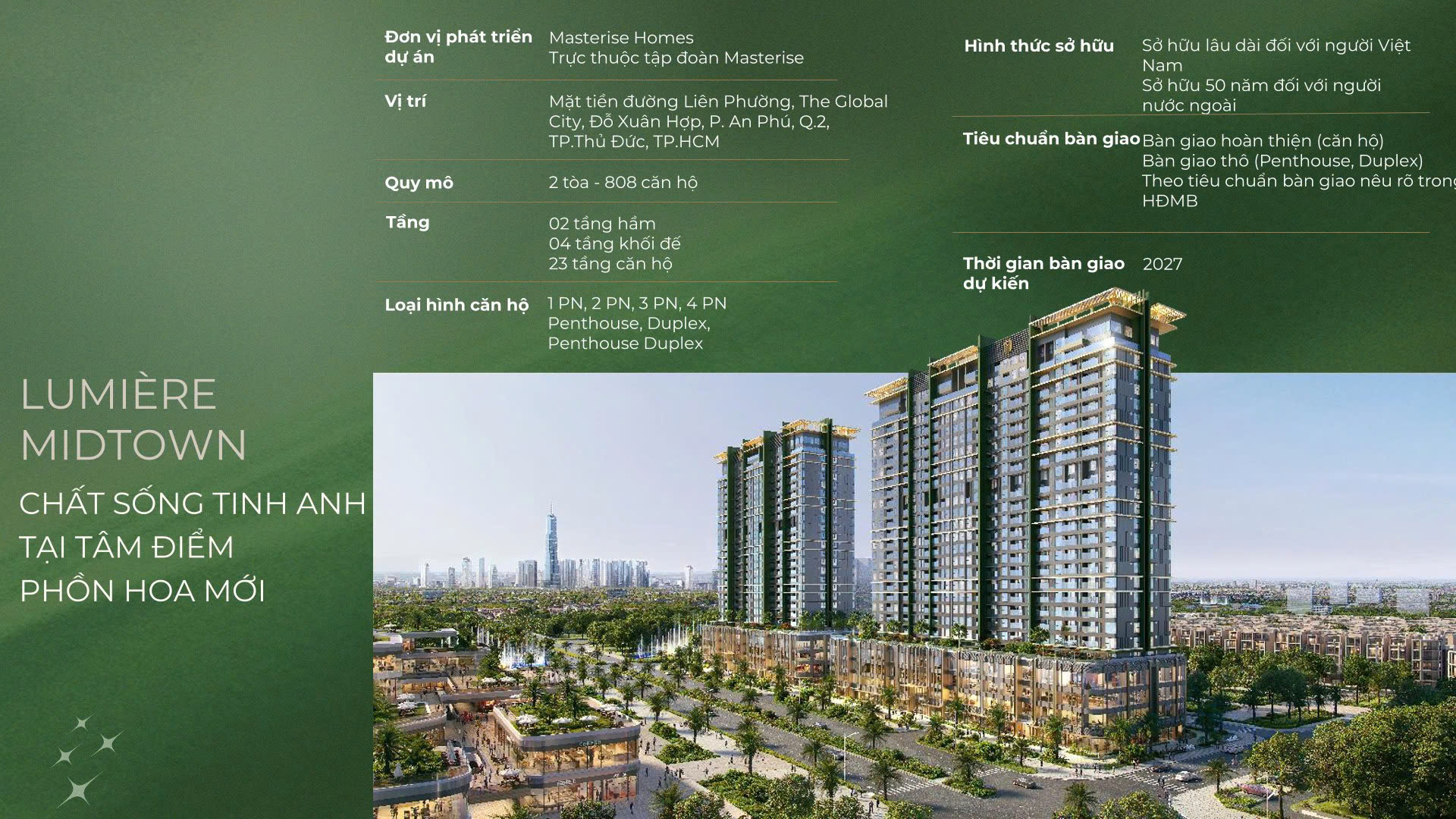 Lumière Midtown là dự án đầu tiên của chuỗi LUMIÈRE được phát triển bởi Masterise Homes tại khu đô thị The Global City, mang đến không gian sống đẳng cấp giữa tâm điểm phồn hoa mới của Thành phố Hồ Chí Minh. Với số lượng giới hạn chỉ 908 căn, dự án được kiến tạo dành riêng cho cộng đồng tinh hoa, nơi mọi tiện ích đẳng cấp được tinh chỉnh để tạo nên một cuộc sống trọn vẹn.